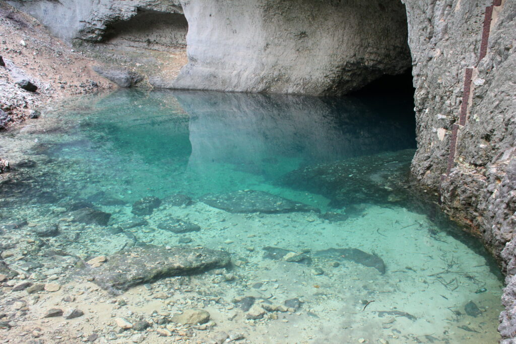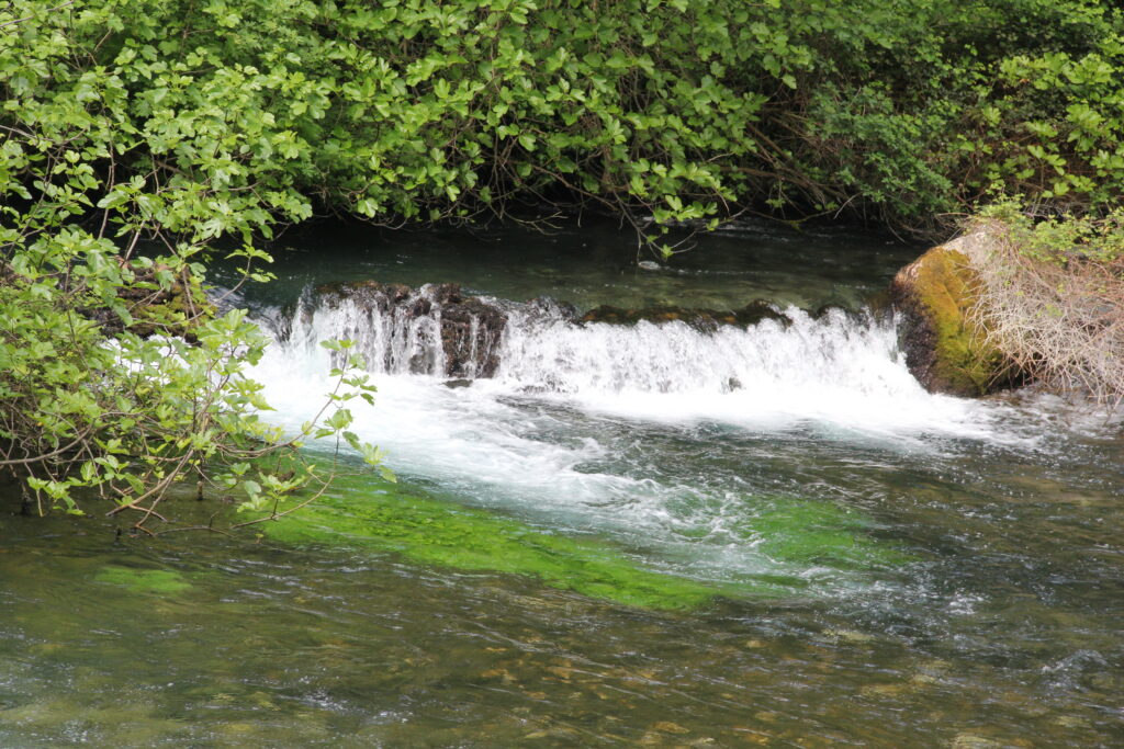 Umgeben von über 200 m hohen Felswänden entspringt hier gleich ein ganzer Fluss, die Sorgue. Es ist das gesammelte Wasser aus Regen und Schnee, das über eine sehr große Fläche im Karstgestein versickert ist und unterirdisch hierher geführt wird. Vor allem im Frühjahr kann die Wassermenge sehr groß sein.